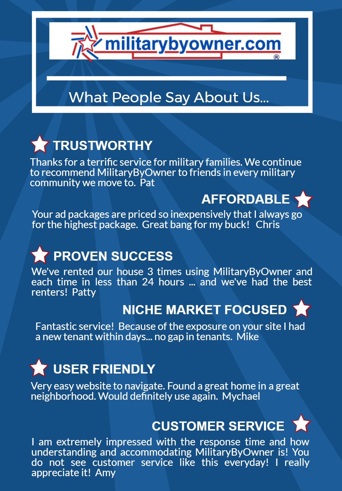 I have been a happy and satisfied customer of MilitaryByOwner for over 10 years and the customer service and quality tenants I have had couldn't be better.